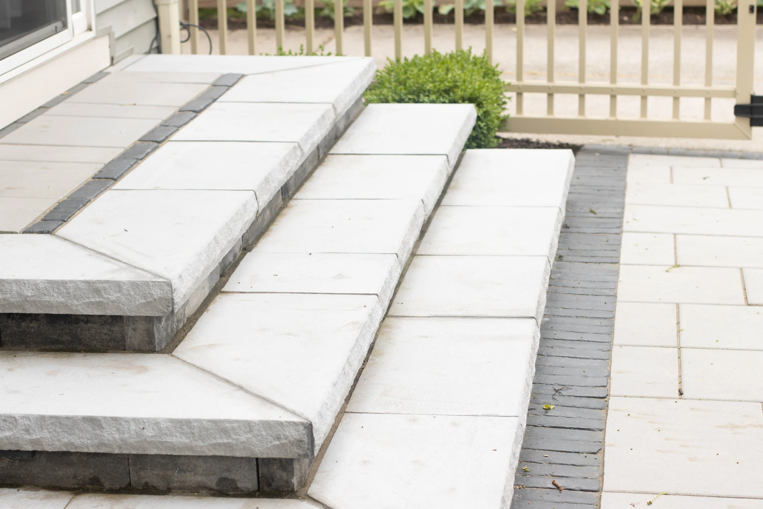 Dark brick edging surrounds this large patio, delineating where the fun, dining, and gathering should take place. After enjoying a meal at the outdoor dining area, the activities move on to the comfortable lounge area, where retaining walls double as extra seating under the cover of a wooden pergola. Custom landscape lighting illuminates delicate foliage set in mulch beds as well as the stairway leading directly to the home’s back door.